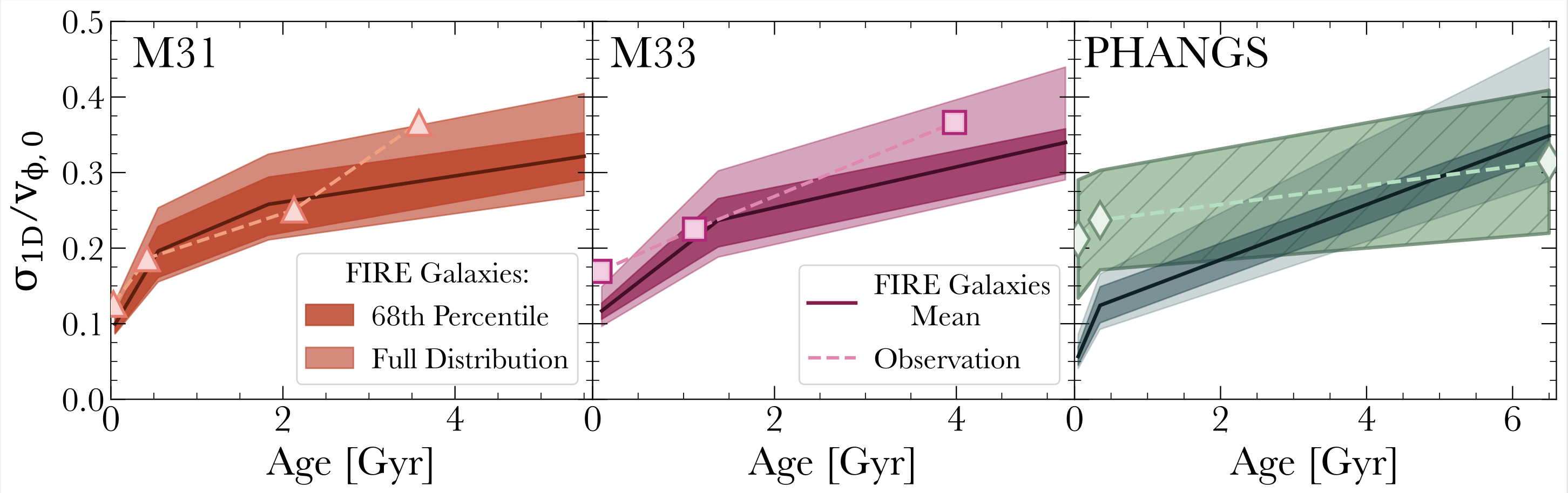 Comparison of stellar velocity dispersion (normalized by galaxy rotational velocity) versus age in the FIRE-2 simulations against observations of M31, M33, and 16 galaxies from the PHANGS-MUSE survey.