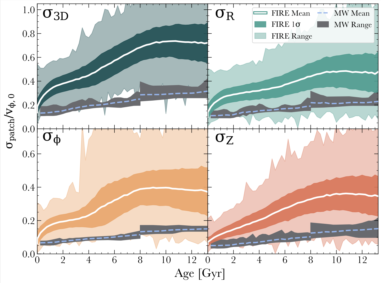 In general, FIRE-2 has significantly hotter stellar kinematics than the MW, with the exception of the youngest stars. This offset is most pronounced for σ3D and σφ, while σR shows better agreement.