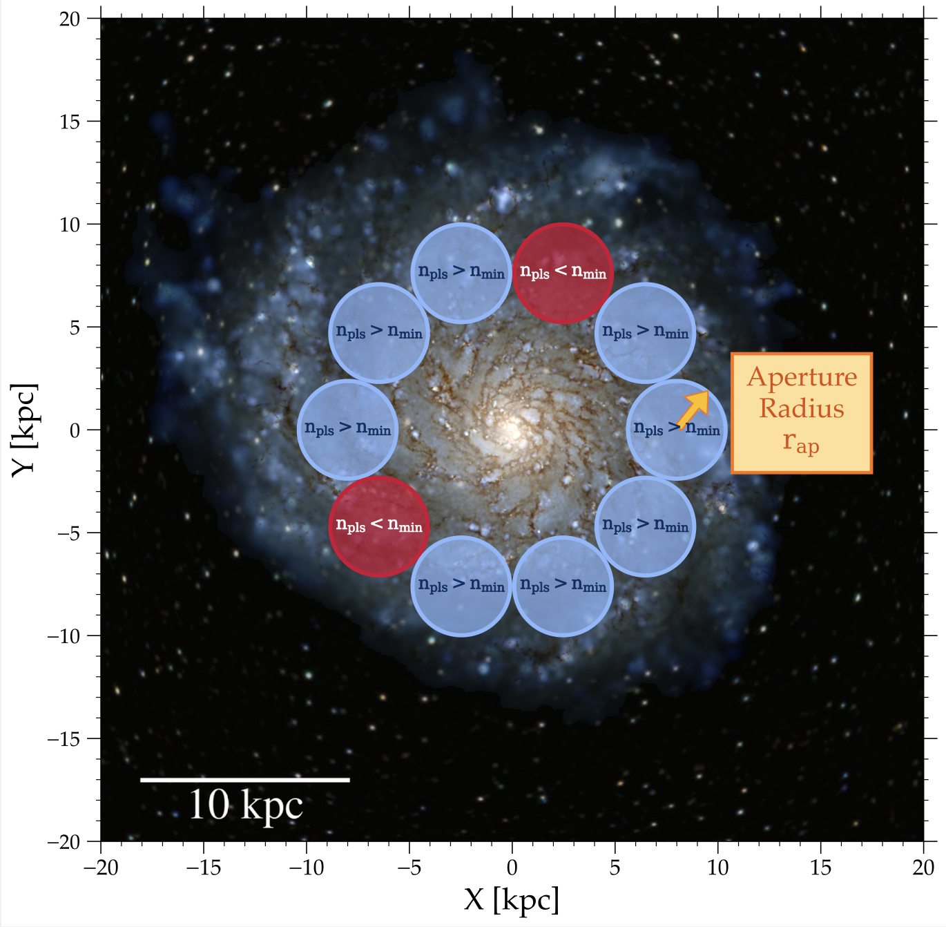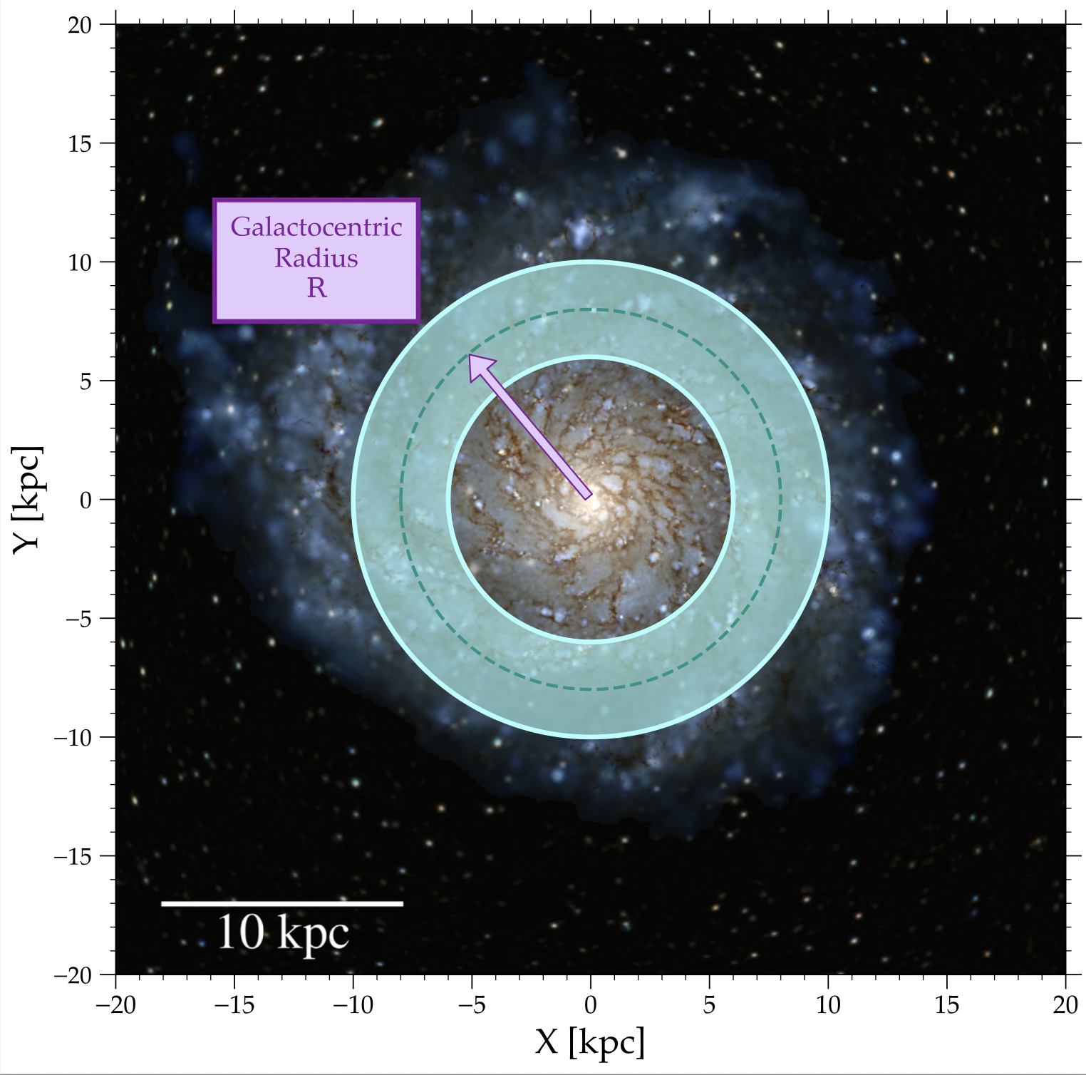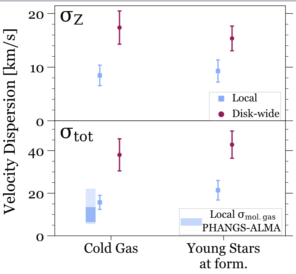 Center Panel: Comparison of velocity dispersions measured locally versus across the annulus (conceptually illustrated in the left and right panels, respectively)for cold dense gas and young stars. Specifically, σZ (top) and σtot (bottom) of cold (T < 300 K) and dense (n > 10 cm-3) gas at present (left) and young (age < 250 Myr) stars at formation (right). The points show the mean across all 14 galaxies, while the error bars show the standard deviation. Magenta circles show the dispersion of gas or stars within R = 6–10 kpc and |Z| < 3 kpc, identical to our previous analyses. The blue squares show the local velocity dispersion, within 150 pc patches, with cold gas patches centered at ≈4 kpc and young star patches centered at 8 kpc (see the text for a further explanation). The shaded region shows the total dispersion of molecular gas in 19 PHANGS-ALMA galaxies: light blue shows the sample’s full range, while darker blue shows the sample’s 16th–84th percentile range.